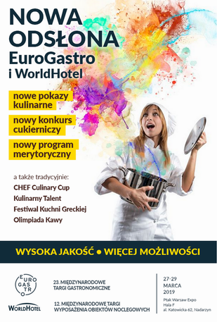 23. Międzynarodowe Targi Gastronomiczne EuroGastro połączone z 12.edycją Międzynarodowych Targów Wyposażenia Obiektów Noclegowych WorldHotel odbędą się w dniach 27-29 marca 2019 r. w Ptak Warsaw Expo. Nowa lokalizacja stwarza szansę na dalszy, dynamiczny rozwój tych wydarzeń oraz zwiększenie komfortu Wystawców i Gości. Nowe konkursy, nowe atrakcje, nowe imprezy towarzyszące, nowe eventy merytoryczne, a wszystko to z zachowaniem najlepszych elementów tradycji Targów, tworzą nowy obraz i nową jakość imprezy. Przy tej edycji przymiotnik „nowy” odmieniany jest przez wszystkie przypadki. I nie jest to przypadek, ale reguła.